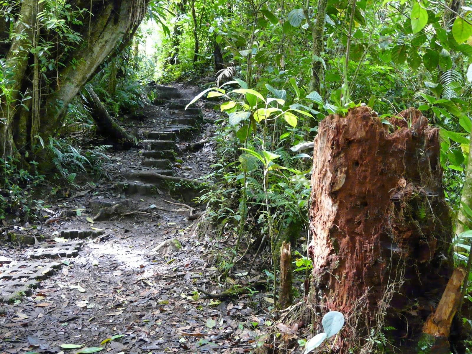Seguimos pelo Sendero Pantanoso, que tem cerca de quilómetro e meio e atravessa a Divisória Continental, inflectindo depois para noroeste. Tal como o próprio nome indica, o caminho passa por uma floresta pantanosa, onde por vezes precisámos de atravessar pequenas pontes de madeira sobre as zonas mais lamacentas. Neste percurso é possível observar magnólias e também podocarpus, a única conífera da Reserva, borboletas e libelinhas, e vários tipos de fungos, que é como quem diz cogumelos, que não tinham de todo o ar de serem comestíveis.