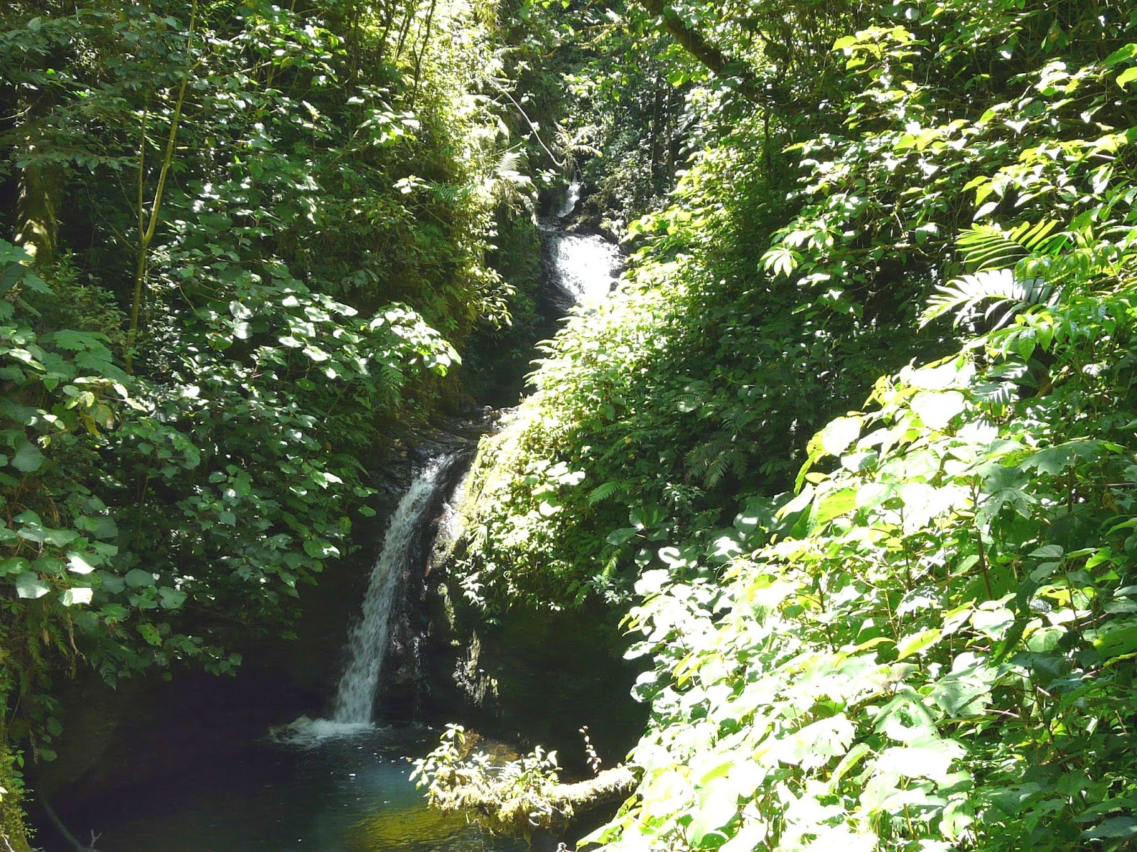Desembocámos no trilho El Río, cujo percurso de também quase dois quilómetros segue ao longo do ribeiro a que dão o nome de Quebrada Cuecha. Já na segunda metade do caminho, um curto desvio levou-nos a uma queda de água, um local tranquilo e solarengo povoado por borboletas. A água desliza em socalcos entre a vegetação densa e forma uma pequena albufeira em tonalidades de azul petróleo, continuando depois o seu curso para leste. De regresso ao trilho, pudemos observar algumas sapotas (Pouteria sapota), árvores de fruto que podem atingir os 25 metros de altura e cuja seiva é um látex que já os índios centro-americanos usavam para mascar há muitos séculos atrás. Na Reserva, estas árvores chamam a atenção principalmente pelas suas enormes raízes em contraforte.