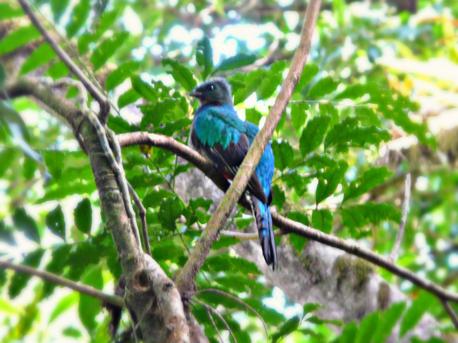 Mal tínhamos percorrido uma centena de metros quando a nossa atenção foi despertada por um ajuntamento de visitantes e guias, todos de olhos e binóculos apontados para uma determinada árvore. Procurando atentamente, conseguimos descortinar um quetzal fêmea – menos colorida e plumosa que o macho – que se deixava tranquilamente observar, pousada num ramo alto. Então, quando tentávamos encontrar um local melhor para tirarmos mais umas fotos, a uniformidade verde foi subitamente quebrada por um relâmpago de penas esvoaçando em tons de amarelo, vermelho e azul, uma visão deslumbrante e fugaz de um quetzal macho que voava de uma árvore para outra. Não consegui impedir-me de soltar um grito de entusiasmo por ter conseguido vislumbrar aquele que era um dos meus objectivos para esta visita – e que, infelizmente, desapareceu tão rápido como tinha surgido.