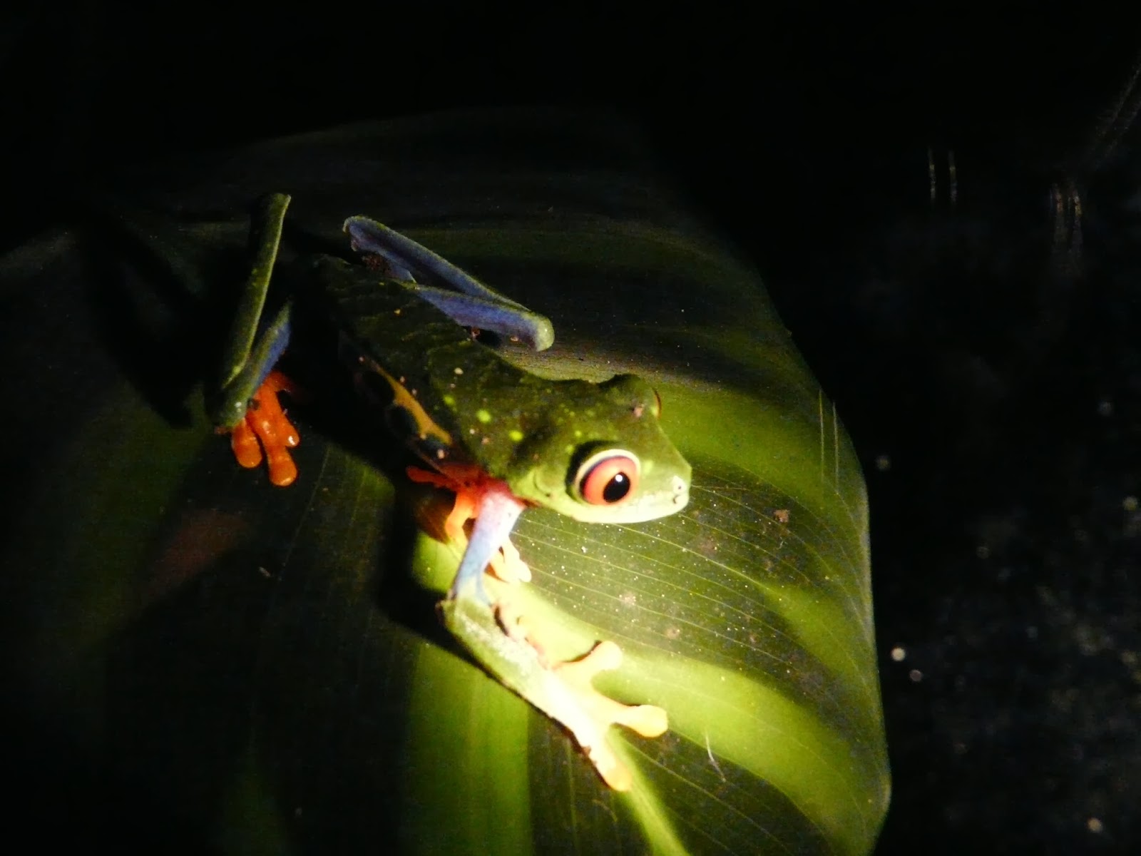 Cada espécie de rã (normalmente mais do que um exemplar) está instalada dentro de uma grande vitrina, cujo interior simula tão aproximadamente quanto possível o habitat natural dos respectivos ocupantes. Com a ajuda dos focos das lanternas e da experiência do Genaro, fomos observando rãzinha após rãzinha, enquanto ele nos explicava algumas particularidades de cada uma delas. Reencontrámos a nossa velha “amiga” blue jeans e conhecemos uma sua “parente”, também tóxica, mas que apresenta a cor verde onde a blue jeans é azul – prosaicamente nomeada rã verde e vermelha ou, taxonomicamente, Dendrobates granuliferus. Diferente mas igualmente tóxica é a Dendrobates auratus, uma rã pequena com riscas verdes e pretas que, por ser diurna, se encontrava aninhada entre as folhas de uma pequena planta, tentando descansar – suspeito que sem grande sucesso. Vimos também a rã de vidro de Fleischmann, tão transparente que é possível distinguir o seu minúsculo coração a bater, e a minha preferida, a rã arborícola de olhos vermelhos (Agalychnis callidryas), cujas cores fazem lembrar um quadro de Mondrian. Apesar dos seus salientes olhos vermelhos, tem um ar simpático e talvez por isso é a rã que mais vezes aparece reproduzida nos postais da Costa Rica (e provavelmente a mais fotografada do mundo).