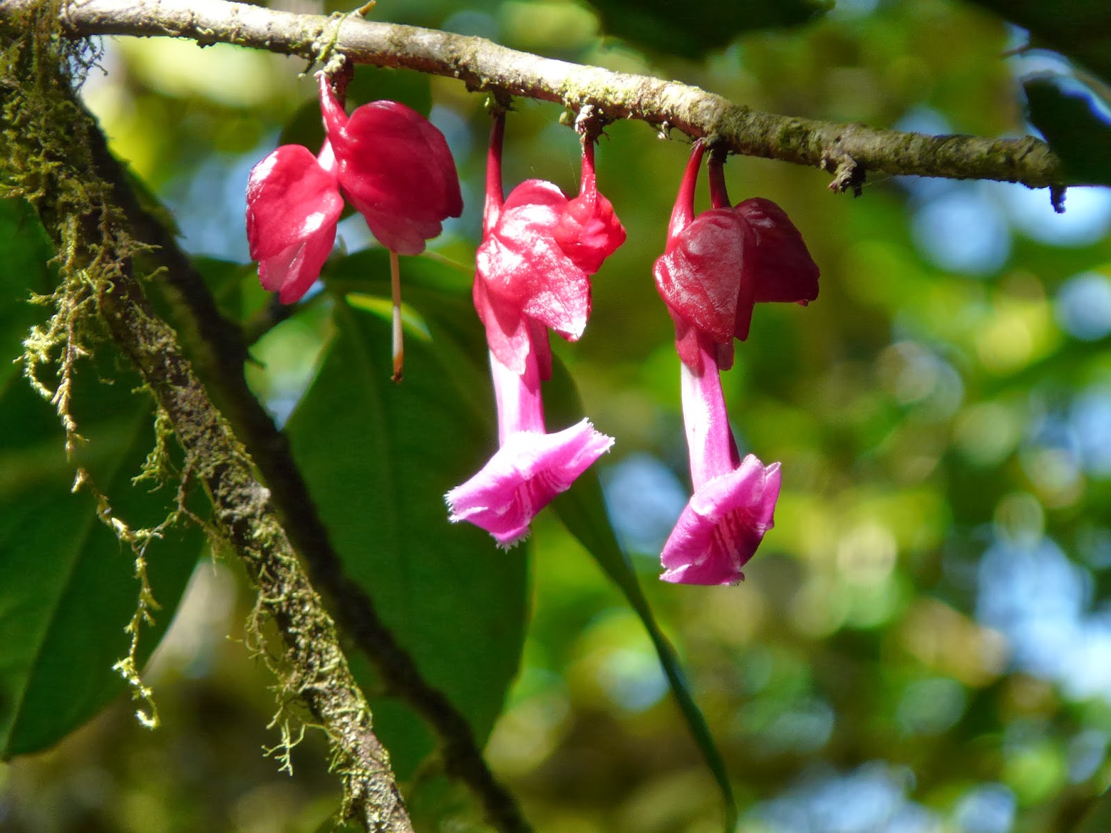 As nuvens que envolvem a floresta nebulosa de Monteverde depositam água sobre as folhas e troncos e permitem a proliferação das plantas epífitas, ou seja, plantas que crescem sobre outras, sendo estas últimas geralmente árvores. Ao contrário das plantas parasitas, que se alimentam da hospedeira, as epífitas alimentam-se da água e dos nutrientes que a omnipresente neblina transporta e nela deposita. Em Monteverde há pelo menos 878 espécies de epífitas, e grande parte das orquídeas e bromeliáceas que vimos são deste tipo. Das mais de 1400 variedades de orquídeas que crescem na Costa Rica, cerca de 500 são encontradas em Monteverde e entre elas contam-se as mais pequenas do mundo. O Diego mostrou-nos ainda as botellitas (“garrafinhas”), umas florinhas cor-de-rosa agrupadas em cachos e cuja forma faz jus ao nome, e as lábios-de-noiva (que também são chamadas de lábios-de-p---), de um vermelho escuro sugestivo.