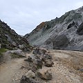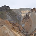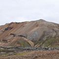 Do outro lado do vale esperava-nos nova subida, esta mais intensa. À esquerda, o Laugahraun; à direita, uma encosta abrupta, composta sobretudo por gravilha, feita de riscas coloridas que faziam lembrar uma manta tradicional: a Brennisteinsalda, uma montanha a que chamam “onda de enxofre” e cujo cume é acessível por um outro trilho pedestre. Mais à frente, fumarolas escapavam-se das encostas e do solo à nossa volta, com o já habitual cheiro activo destas manifestações vulcânicas. Aqui o percurso está delimitado por cordas presas em estacas, um aviso nítido de que não será boa ideia sair do caminho marcado.
