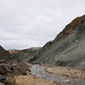 Ao fim de uns bons 20 ou 25 minutos, nova mudança de cenário: chegámos ao desfiladeiro Graenagil, dominado pelo cinzento-esverdeado da montanha Blahnúkúr. Aqui o trilho começa a descer suavemente, contornando a orla sinuosa do Laugahraun até chegar ao nível do pequeno rio que corre no fundo do desfiladeiro. É uma zona mais fácil de percorrer do que a anterior, e gostei bastante deste trecho do percurso. Como já tínhamos esgotado uma parte das nossas reservas de líquidos, decidimos encher uma garrafa com água do rio, que parecia fresca e convidativa para beber. Só que… fresca estava, sem dúvida, mas sabia demasiadamente a enxofre. Não ficámos fãs, e acabámos por deitar fora o resto.